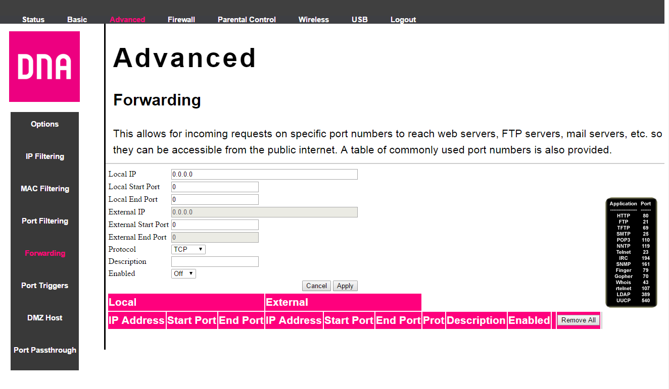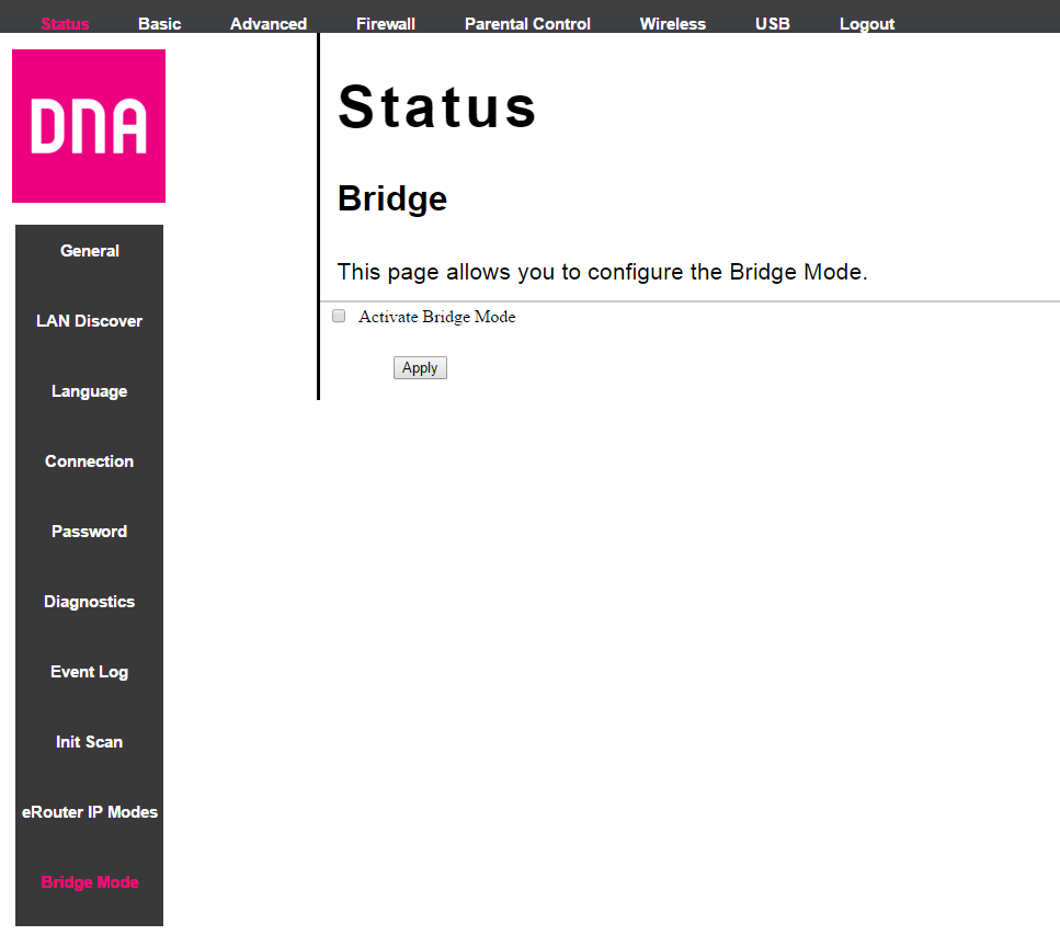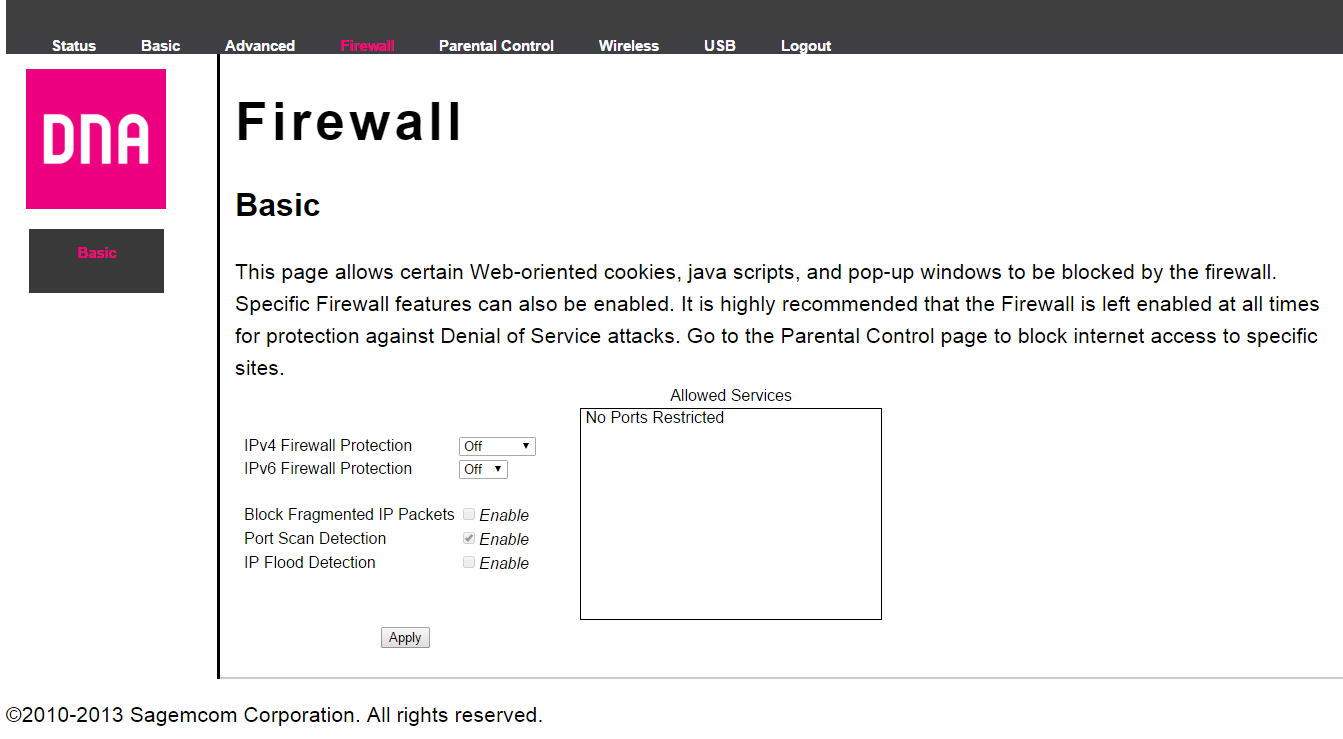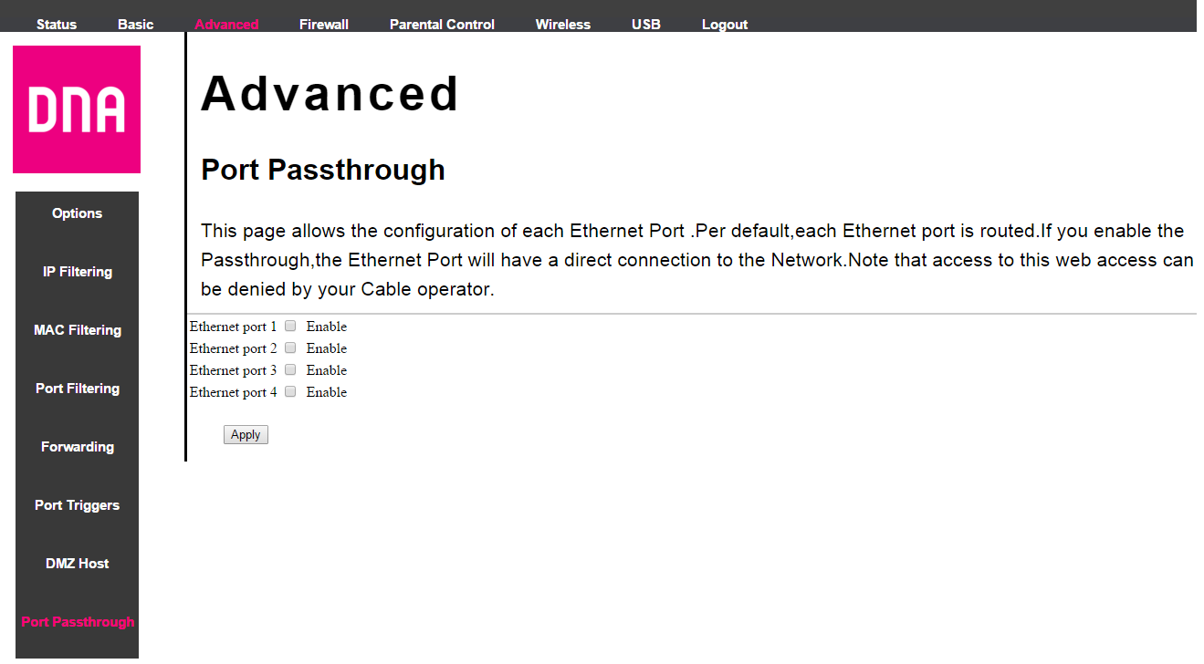 Oletuksena Sagemcom F-3284DC DNA Ethernet-portit ovat reititettyjä, jolloin niihin liitetyt tietokoneet ja muut verkkolaitteet saavat paikalliset IP-asetukset modeemin omalta DHCP-palvelimelta. Voit kuitenkin muuttaa yksittäisten porttien tilaa sillatuksi ylävalikon Advanced-kohdasta, valitsemalla sivuvalikosta Port Passthrough. Porttien valinnan jälkeen Apply muuttuvat valitut portit sillatuiksi ja IP-asetukset tulevat niihin liitetyille laitteille tämän jälkeen DNA:n DHCP-palvelimelta (max. 5 kpl). Tällöin on myös hyvä tiedostaa, että modeemin palomuuri (Firewall) ei enää suojaa kyseisissä porteissa olevia laitteita.
