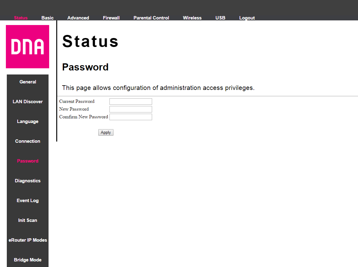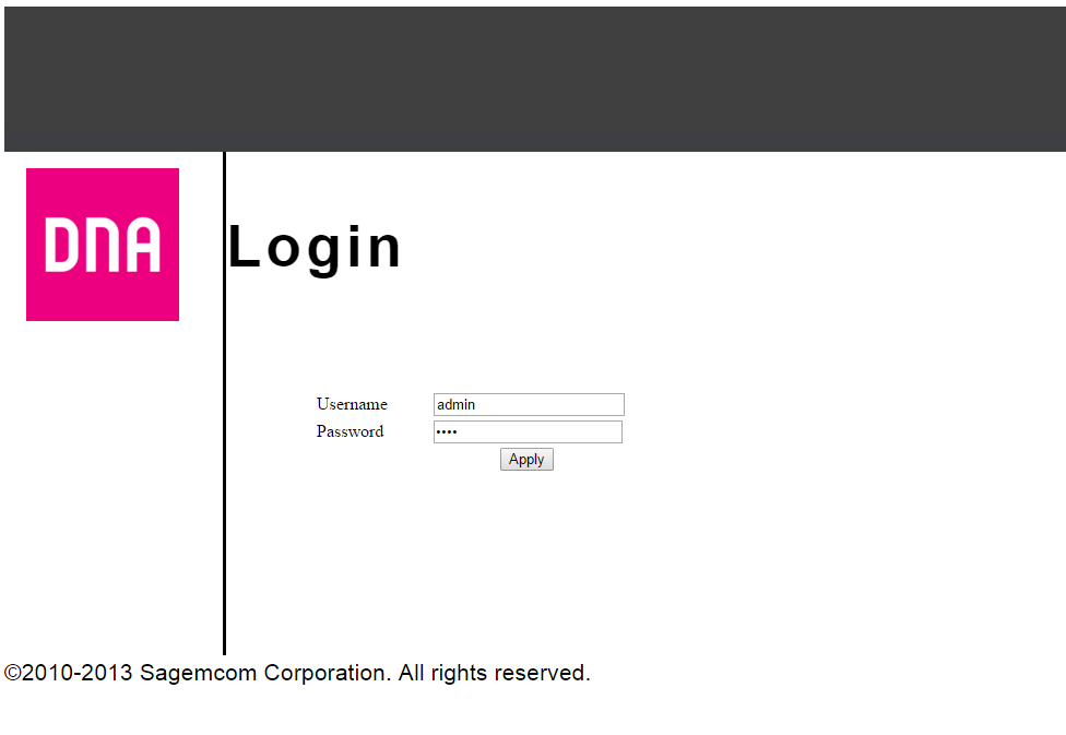 Kaikilla DNA Kaapelimodeemi WLAN Sagemcom F-3284DC DNA modeemeilla on tehdasasetuksiltaan sama salasana, 1234. Salasanaa tarvitaan, jotta laitteen asetuksia voidaan muuttaa. Salasana tulee vaihtaa tietoturvasyistä, jotta ulkopuoliset eivät voi hallinnoida modeemia. Kun olet kirjautunut asetussivuille, saat vaihdettua salasanan seuraavasti:
