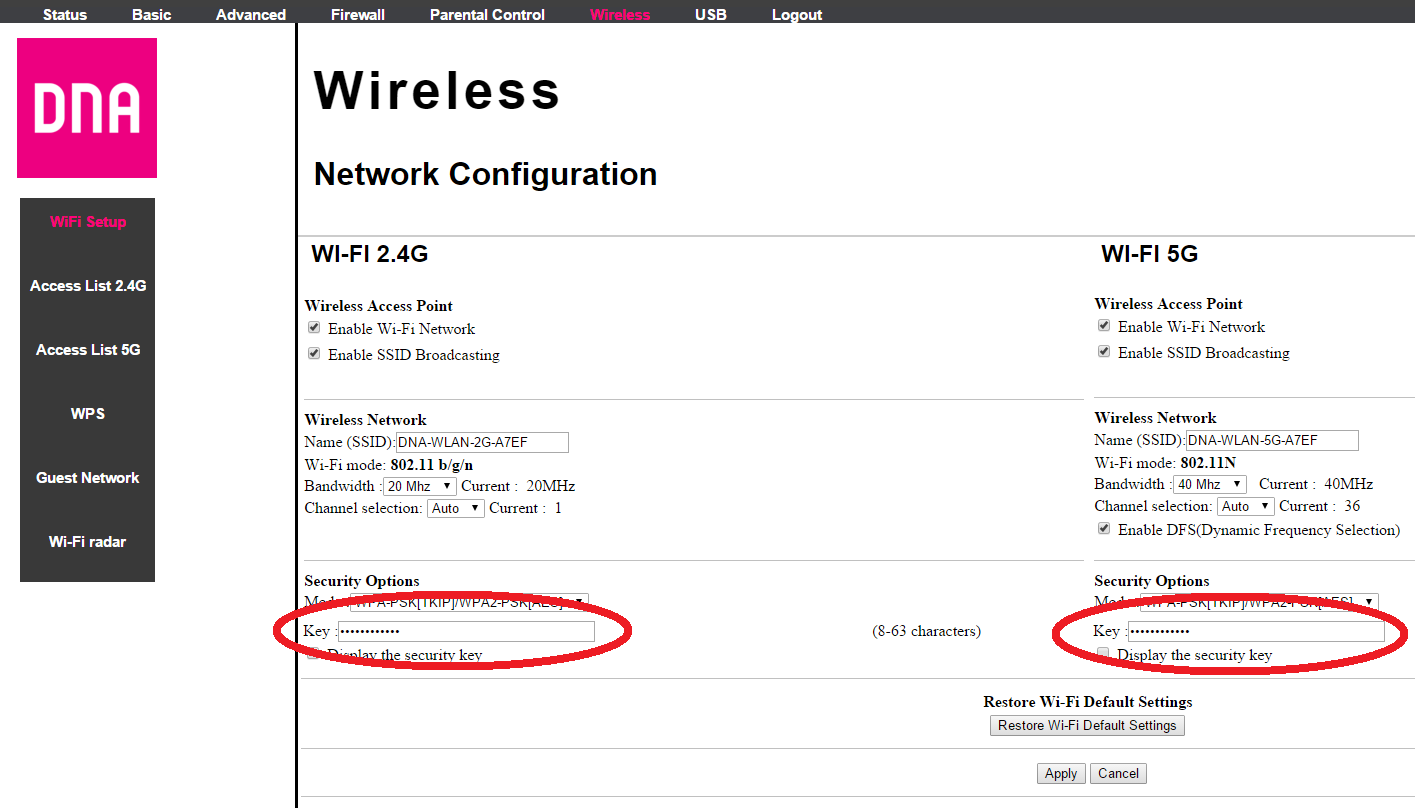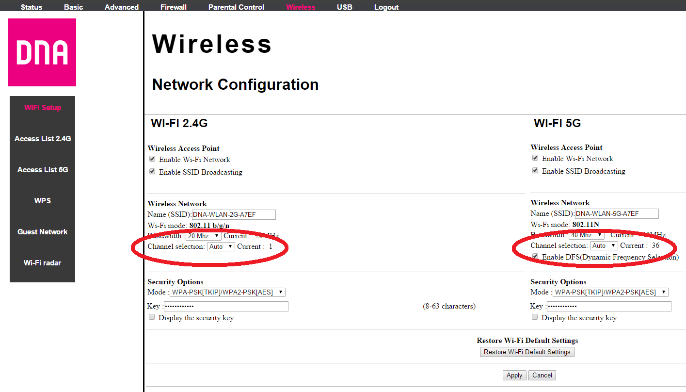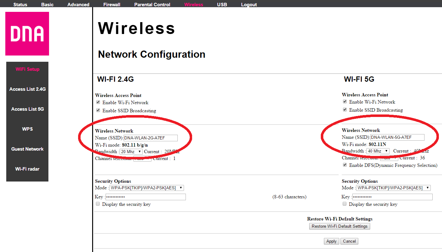 DNA Kaapelimodeemi F-3284DC DNA:ssa on radiot sekä 2,4 että 5 GHz:n taajuuksille. Molemmat ovat oletuksena päällä ja erinimisinä, jolloin haluttu taajuus voidaan valita päätelaitteella valitsemalla vain oikean niminen verkko (DNA-WLAN-2G-XXXX tai DNA-WLAN-5G-XXXX). Valitse asetussivuston ylälaidan valikosta Wireless, jolloin avautuu WLAN-perusasetussivu. Kyseisen sivun kautta voit muuttaa langattoman verkon käyttöön liittyviä asetuksia. Näiden asetusten on vastattava niiden päätelaitteiden asetuksia, joilla haluat käyttää langatonta verkkoa.
