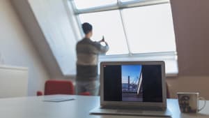 Vaaleapaitainen kalju mies seisoo kaihtimien varustaman ikkunan luona, hänen heijastuksensa näkyy lasissa.