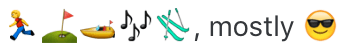 Tykkäätkö emojeista? Ei biotekstin tarvitse olla pelkkää tekstiä. Voit esimerkiksi kuvata omia harrastuksiasi näin: