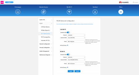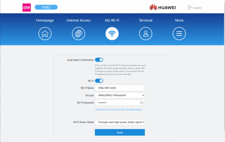 My Wi-Fi -välilehdellä voit valita onko yhdistelmäverkko (2.4 GHz & 5 GHz) käytössä. Jos haluat poistaa yhdistelmäverkon käytöstä, valitse Dual-band Combination -valinnassa OFF. Muutos tallennetaan painamalla Apply.