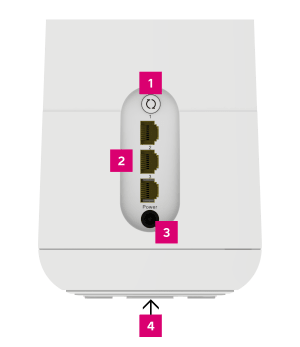 Kaikkia liitäntöjä voi käyttää WAN-liitäntänä nettiyhteydelle. Loput liitännät toimivat automaattisesti LAN-liitäntöinä ethernet-johdolla kytkettäville laitteille. - Virtaliitäntä