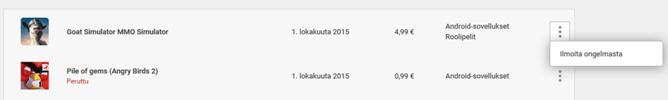 Voit tehdä reklamaation play.google.com -sivun kautta. Kirjaudu sivulle samalla Google-tunnuksellasi, jonka ostoksesta reklamoidaan.
