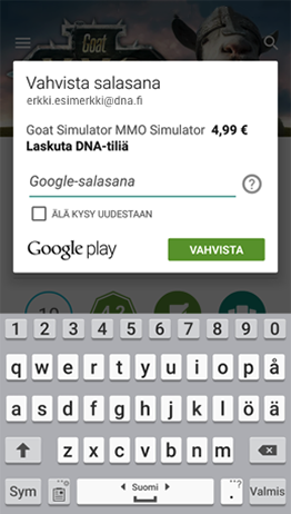 Voit ostaa Google Play -kaupasta sovelluksia puhelimella tai tabletilla, ja maksaa tekemäsi ostokset DNA:n puhelinlaskulla tai DNA:n prepaid-liittymän saldolla. Huomaathan, että liikkuvan laajakaistan liittymät eivät ole palvelun piirissä.