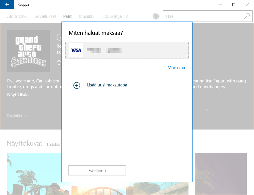 - Maksutapa lisätään samalla tavoin kuin tietokoneen Microsoft Storessa.