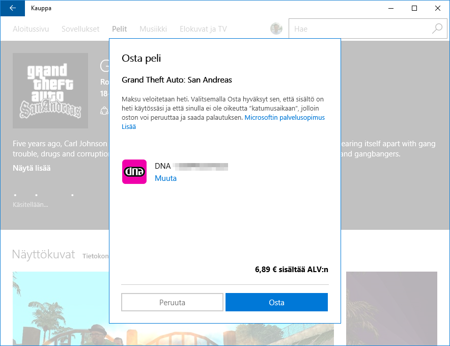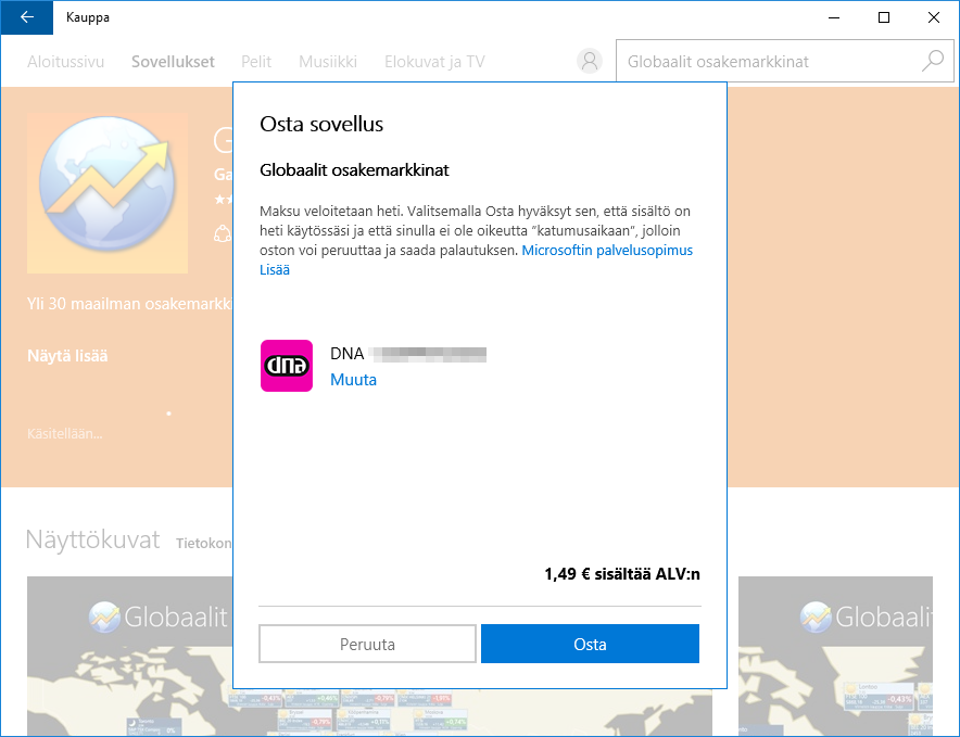 7. Nyt voit ostaa sovelluksia Windows-kaupasta puhelinlaskulla tai prepaid-liittymäsi saldolla. DNA ei lähetä ostoksistasi kuittia, vaan Microsoft lähettää jokaisesta ostoksesta kuitin Microsoft-tilisi sähköpostiosoitteeseen.