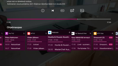 Voit painaa myös kaukosäätimen OK-, tai nuolipainiketta ja saat kanavanauhan näkyviin. Kanavanauhaa selaamalla voit pikaisesti selata, mitä ohjelmia muilla kanavilla on meneillään ja pääset helposti vaihtamaan kanavaa. Käytä kaukosäätimen nuolipainikkeita oikealle ja vasemmalle ja vahvista valinta kaukosäätimen OK-painikkeella.