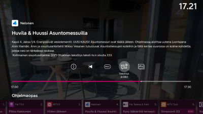 Paina kaukosäätimen OK-, tai nuolipainiketta ja saat meneillään olevan ohjelman tarkemmat tiedot näkyviin. Voit liikkua näkymässä kaukosäätimen nuolipainikkeilla. Valinta vahvistetaan OK-painikkeella.