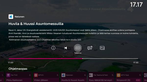 Paina kaukosäätimen OK-, tai nuolipainiketta ja saat meneillään olevan ohjelman tarkemmat tiedot näkyviin. Voit liikkua näkymässä kaukosäätimen nuolipainikkeilla. Valinta vahvistetaan OK-painikkeella. Jos ohjelma on tallennettavissa, voit laittaa ohjelman tallentumaan valitsemalla REC-kuvakkeen. Jos ohjelma ei ole tallennettavissa, REC näkyy harmaana, eikä ole valittavissa.