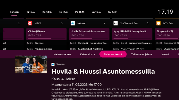 Kategorioiden kautta (Elokuvat, Sarjat ja Urheilu) löydät helposti suosikkiohjelmasi, joita voit katsoa vaikka heti tai laittaa tallentumaan, jos tallennus sisältyy tilaukseesi. Osa kanavien ohjelmista on katsottavissa 2-7 vuorokautta lähetyksen jälkeen ja jokaisen ohjelman kohdalla näkyy, kuinka kauan ohjelma on vielä katsottavissa. Osa ohjelmista on katsottavissa kolmannen osapuolen sovelluksessa (Yle Areena, MTV Katsomo).