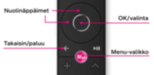 Pääset DNA TV:n Menu-valikkoon helposti kaukosäätimen Menu-painikkeen kautta. Käytä kaukosäätimen nuolipainikkeita ylös ja alas sekä oikealle ja vasemmalle. Vahvista valinta kaukosäätimen OK-painikkeella. Takaisin edelliseen näkymään pääset aina valitsemalla kaukosäätimen Paluu-nuolipainikkeen avulla.