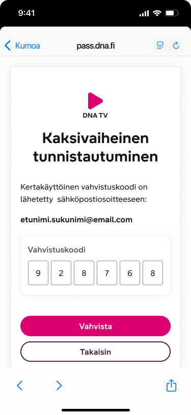 Vahvista tunnistautuminen syöttämällä sähköpostiisi lähetetty vahvistuskoodi.